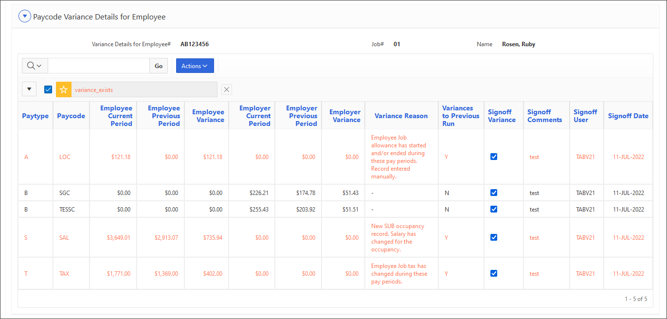 This screen displays the same information as in ‘FQ090 - Payroll Variance Details and Signoff’ in PUI (from V20 onwards).