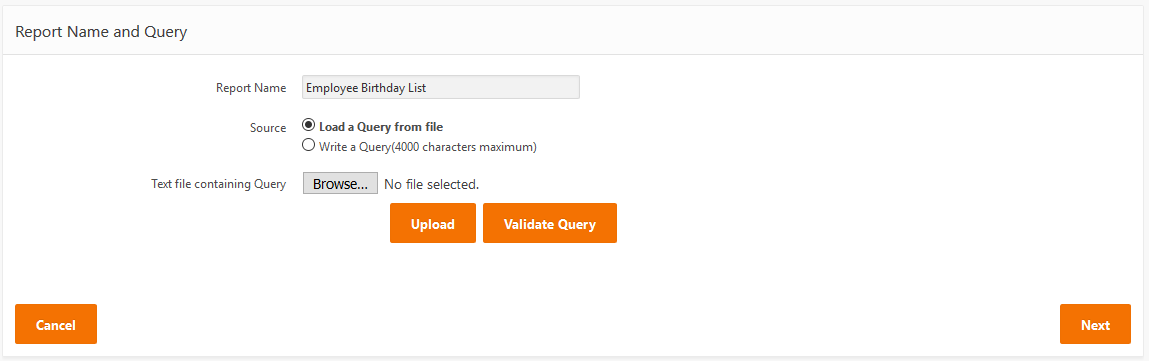 Name your Report and select the source of your query - either Load Query from file, or Write a Query.