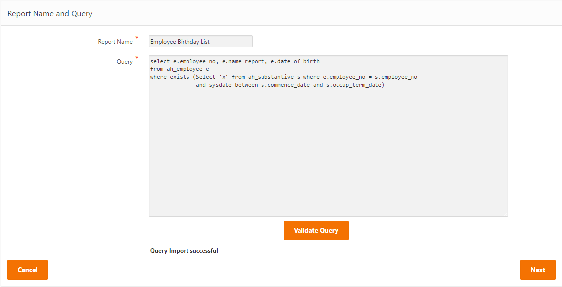 Use the Validate Query button to ensure there are no errors. The Validate must be successful to proceed.