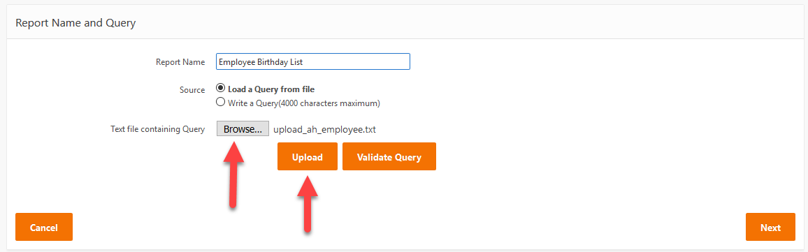 To load your Query from a file, click on the Browse button to locate and select your text file, then click Upload.