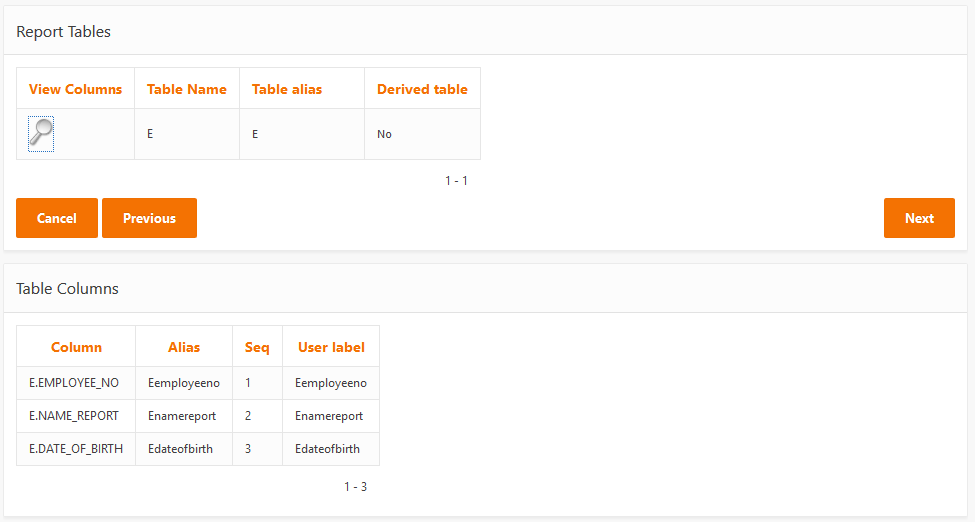 Press Next to view the tables and columns selected.