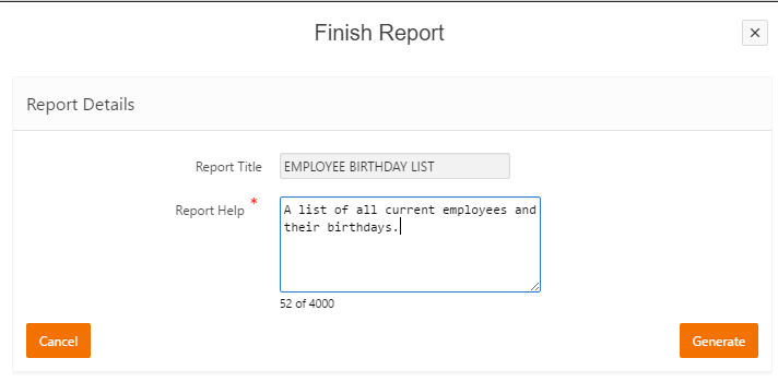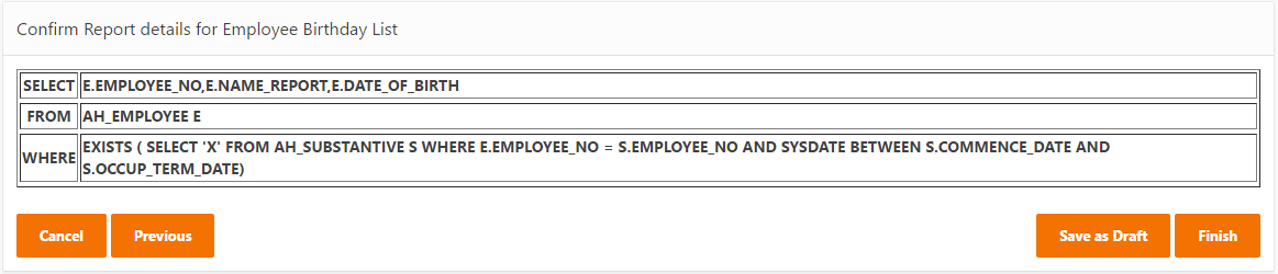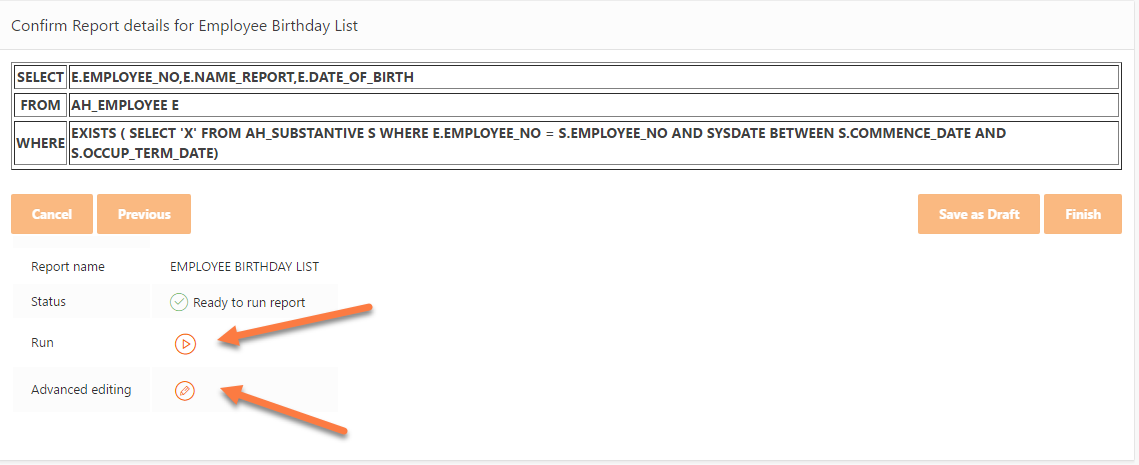 Click on Save as a Draft button to edit again before running the report or click the Finish button to generate the report.