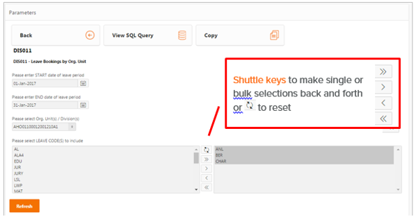If the report has parameters, the parameters will display at the top of the report. Select/enter the parameter values, and then click on the ‘Refresh’ button to display the data.